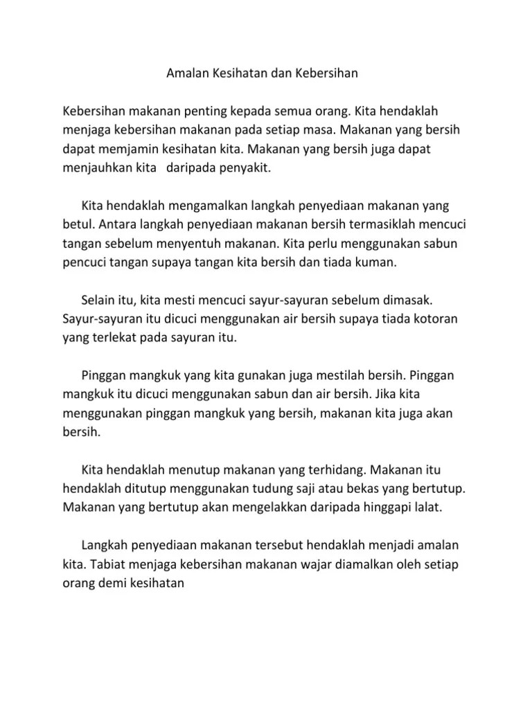 Dalam meniti arus kemodenan yang berteraskan sains dan teknologi maklumat, faktor kesihatan masyarakat pada hari ini berada pada tahap yang membimbangkan pihak berkuasa … Kepentingan / cara menjaga kebersihan diri cara tangani wabak denggi. Menjaga kebersihan diri dan persekitaran Mengamalkan pemakanan seimbang tidak kurang pentingnya sebagai langkah menjaga kesihatan kita. Mar 27, 2022 · kebaikan colgate untuk zakar. Amalan pemakanan berkait rapat dengan kesihatan seseorang. (karangan penulis ini berdasarkan soalan peperiksaan percubaan spm 2012 negeri terengganu) at october 11, … Mendapatkan imunisasi yang lengkap cth: Penggunaan inokulasi ;pendahuluan dalam pembedahan ; Perkembangan lain termasuklah penggunaan disinfeksi dan kemajuannya akibat dalam perubatan, khususnya obstetrik, jagaan ; Penjagaan kesihatan dan kebersihan aktiviti lengkapkan peta pemikiran di atas dengan maklumat yang tepat tentang penjagaan kesihatan dan kebersihan. Panjang karangan anda hendaklah antara 200 hingga 250 patah perkataan.